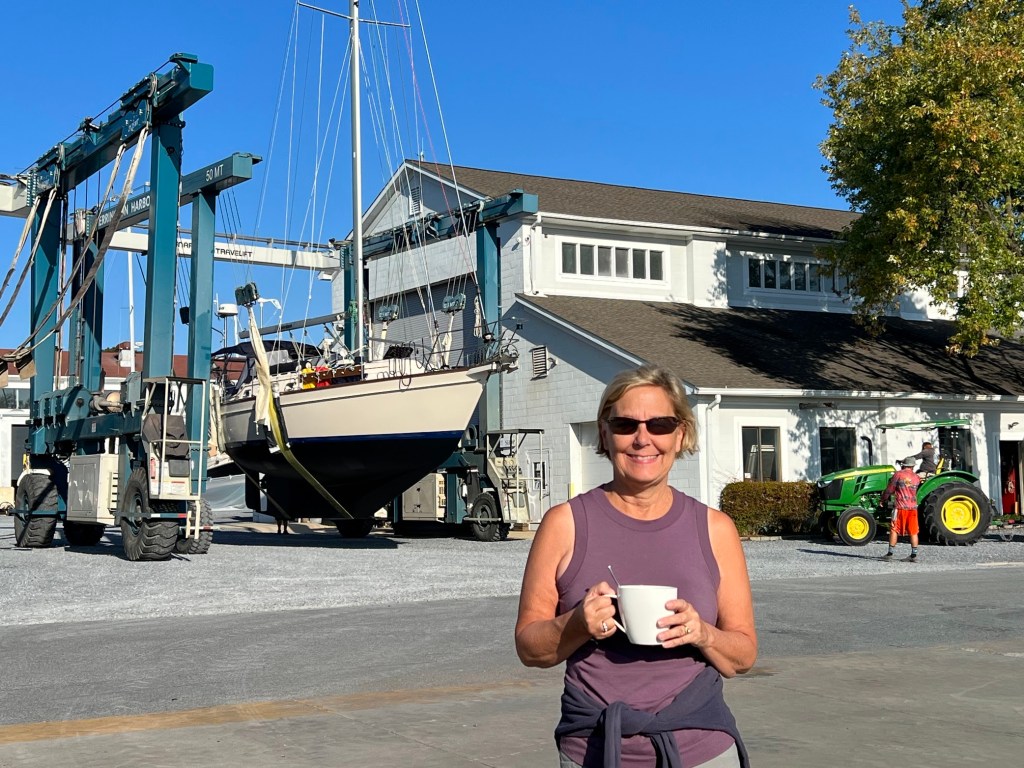So, since we were delayed a day getting the boat in the water, we slept on the boat in the boatyard last night. Since we are “on the hard” we did not have the benefit of air conditioning, however the weather has cooperated and last night it dropped down into the low 60’s so the weather was great for sleeping with the hatches open. We were up fairly early this morning since we knew they would be launching our boat today. I think we were up around 7 – 7:30 am. The guys started showing up and getting moving about 8 am. We had just made coffee when we heard the, “beep, beep, beep” of the travel lift coming over to our boat to pick us up to put us in the water. We quickly put some lines on both the bow and stern on both sides so that when the boat was put in the water they would have lines available to move and control the boat. Then we scampered down the ladder and out of the way for them to move the boat to the water.