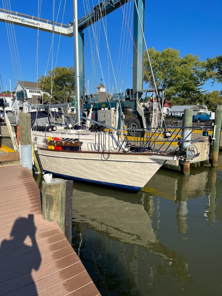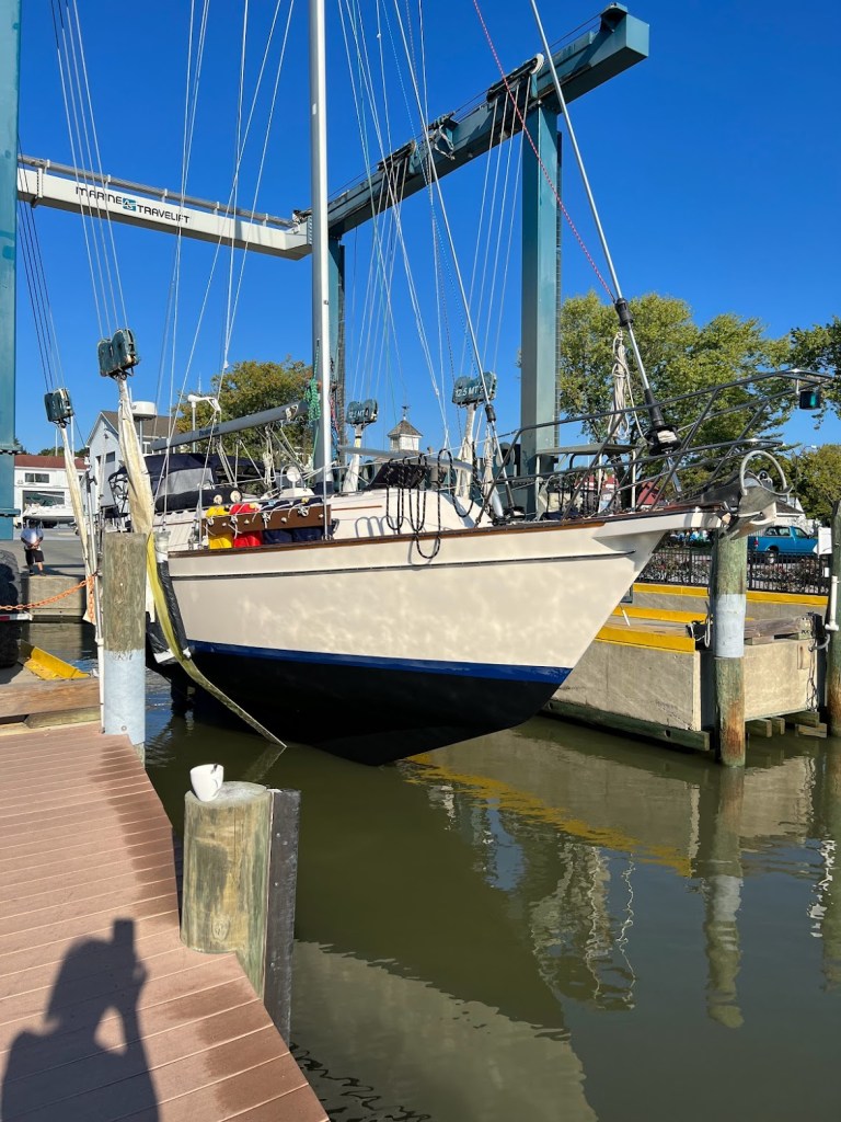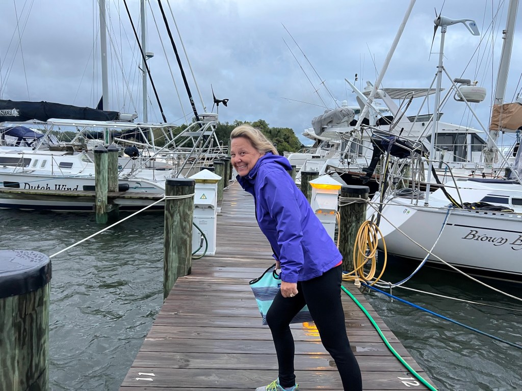 The tide here in Portsmouth is normally around 1 – 1.5 feet, however we are still getting some higher tides from Hurricane Ian. The tide here tonight after dinner was high enough that the docks we were tied to were about 1 foot underwater. The boats sat so high in the water that it was very difficult to get off of Ed and Evelyn’s boat at the end of the evening to head to our boat for the night. We actually had to use a spare halyard to lower us down to the dock. Mark and I took our shoes off and waded through the water back to our boat.