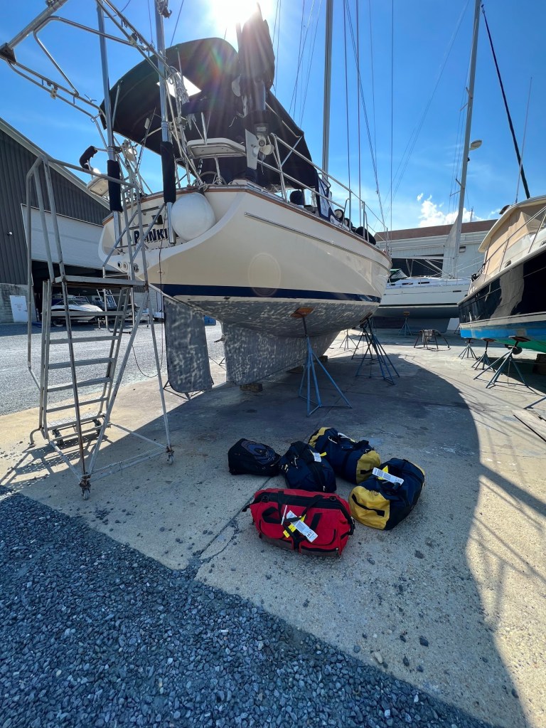 Our first look at Painkiller after 2 months of being away. We were quite disappointed to see that the boat had no bottom paint, no prop and still some work to be done to finalize the autopilot. The boat is scheduled to go in the water on Thursday morning. That’s 4 days from now, but with the labor day weekend, that only allows the workmen 2 working days to get all this done. Paint needs time to dry. By our calculations this is not looking good to stay on our timeline. First order of business, hunt around the yard for a ladder or some stairs to get aboard the boat. Mark found the stairs to wheel over so we could get aboard. Then we hauled our bags aboard and repacked the minimal amount of things we would need at the hotel into a smaller bag. Checked things out on the boat, batteries ok, etc.