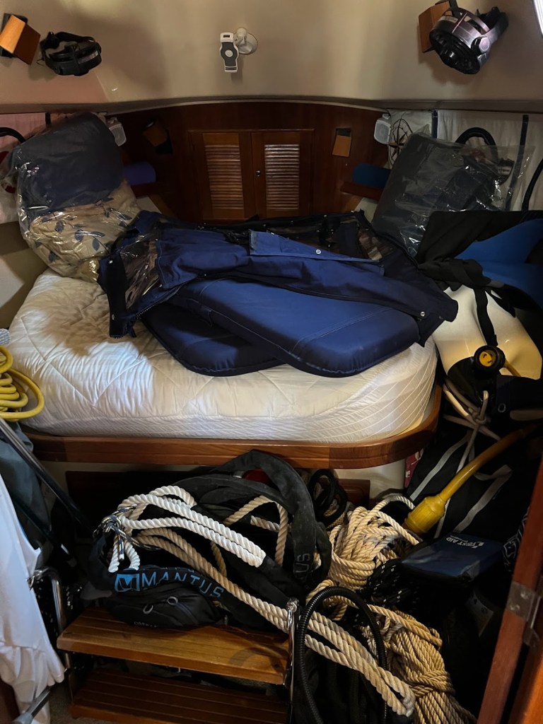 This is the mess that was our master cabin. In order to have people doing work on the boat, we needed to empty the 2 large lockers that we have in the cockpit of the boat so that they had access to install the new autopilot. So, imagine that we take the contents of your garage and put it in your bedroom. Yes, that what we have here. There is simply no other space to put anything so it has to go there. So in order to unpack and put clothes away, we first had to re-home all this stuff. So, yes unpacking 4 duffle bags took all day.