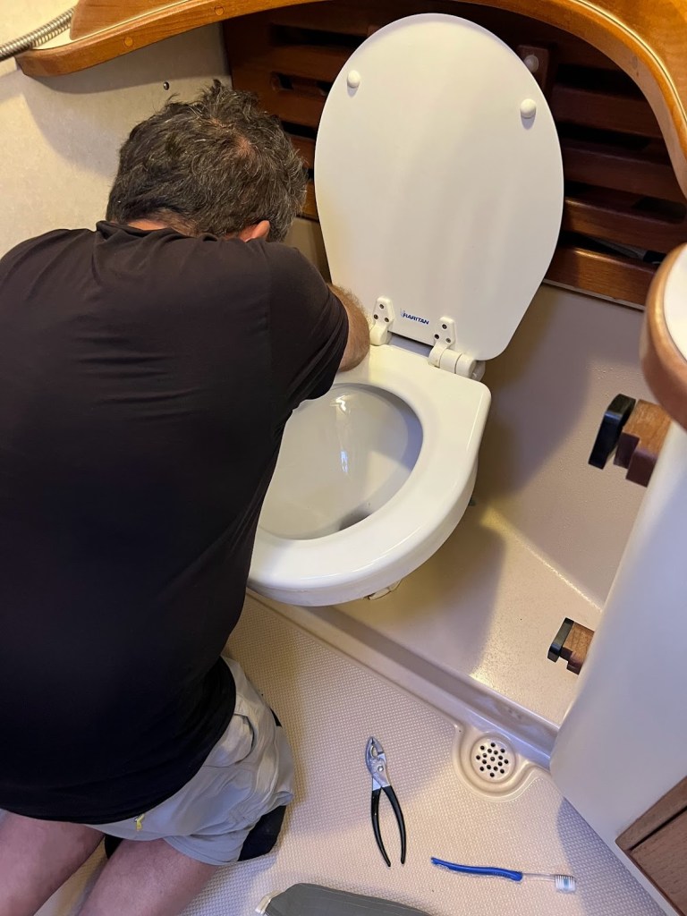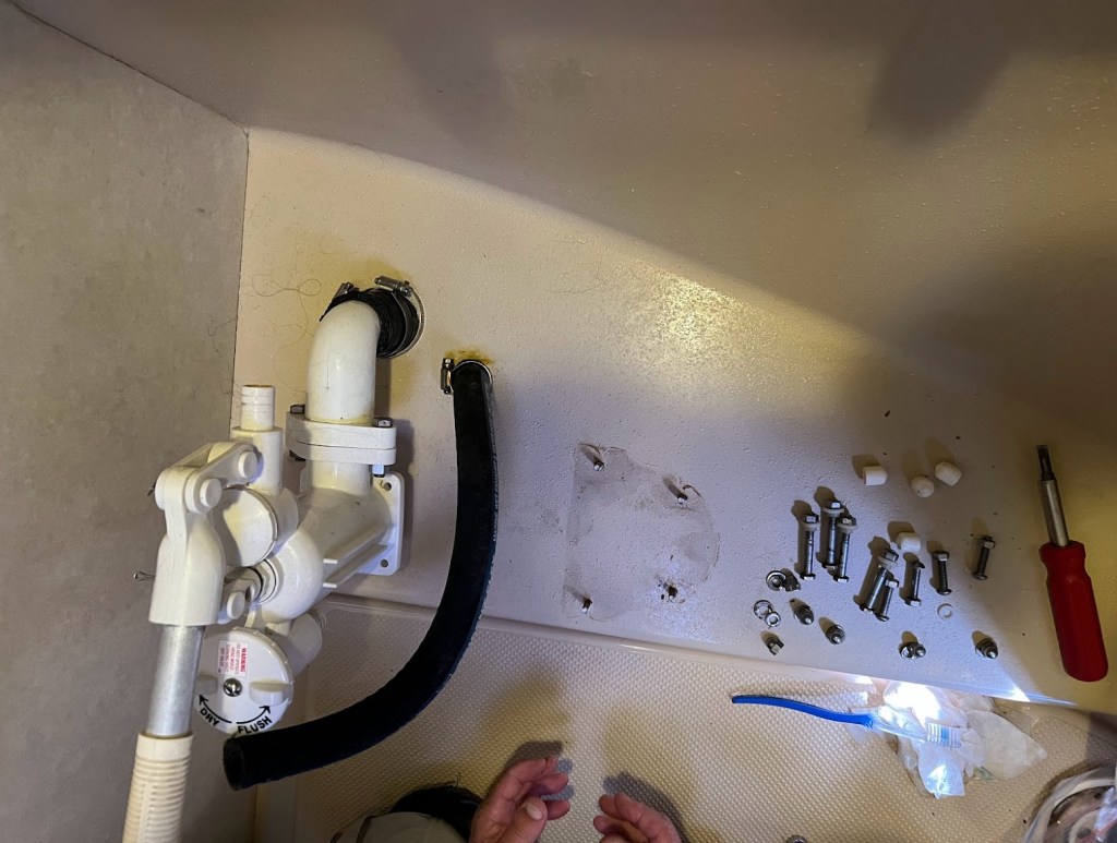 First up was the job that you add to the list and then continually de-prioritize it because, let’s face it, no one wants to work on the head (that’s what ya call a marine toilet). Ours has had a slow fresh water leak that we think is coming from the base of the toilet. The base is a large plastic piece that the toilet and the pump mounts to. This plastic piece is likely about 20 years old and looks like it hasn’t been replaced in quite sometime, at least the 10 years that we have owned the boat. Over time plastic can crack or warp due to age and this is likely why it is now leaking. In order to replace this part, we have to basically dissemble the entire toilet. While we are at it, it’s a good time to also rebuild the head which involves replacing all the rubber parts and O rings and such that wear over time.