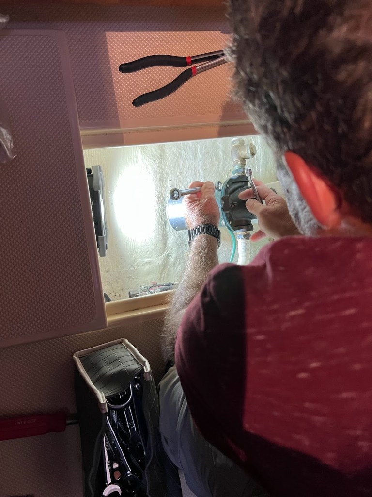 The next day we decided we would tackle installing our new head tank monitor. This is a monitor that goes onto the outside of our black water tank so we know when it is full and needs to be emptied. Today, it’s just guess work. As Mark was getting started on this project, he went to the hold in the floor of the galley where we store the paper towels to get some more. When he opening this hold, I could hear him say, “Why is there water in here?” That is never a good thing to hear on a boat. So we pull everything out of the hold area that is stored there, start to mop up the water and work to determine where the water is coming from. In this area, we have 3 thru hulls (thru hulls are basically holes in the boat that allow sea water to come in through a fitting and hoses that feeds sea water to various systems that requires sea water for cooling or running). One thru hull is the drain for the kitchen sink, another thru hull is the inlet for the air conditioning pump, and another thru hull is the inlet for the generator. We quickly determined that it appears the inlet for the generator seems to be leaking. It appears to be leaking where the hose connects to the sea strainer. A sea strainer is a device that is inline with the hose that strains the water coming in so that it captures things like seaweed, debris in the water, etc. so those things don’t end up in your generator. It appears that the fitting where the hose attaches to the sea strainer is plastic. Plastic fittings are never a great idea as they are more likely to crack and break than a bronze fitting. We also noticed that the sea strainer itself has duct tape on the bottom of the sea strainer. We haven’t used our generator that often so we haven’t really paid attention to this system very much. But as you can imagine it’s not really a good idea to have duct tape on something that lets in sea water into the boat. So, with the leak and finding duct tape here we have decided that we need to address this and forgo our project of installing the head tank monitor.