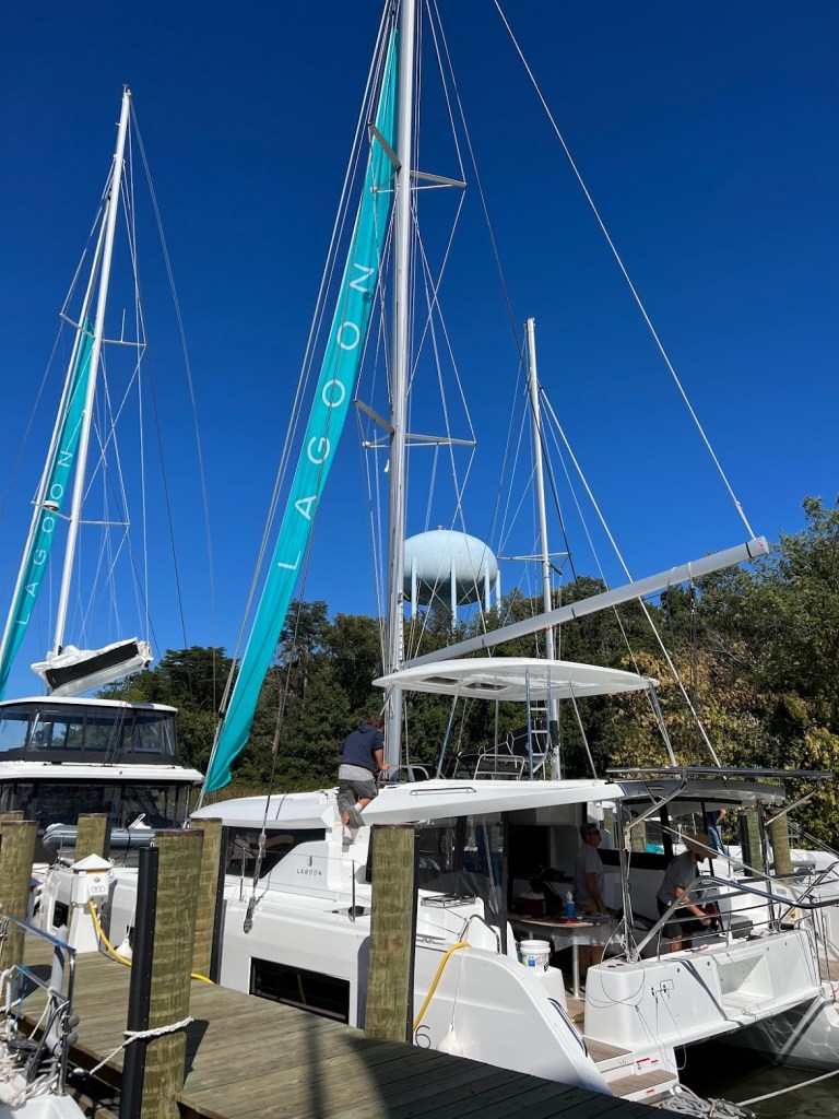 We finally got the correct part shipped for our watermaker and Mike, our repair guy was finally able to get the watermaker put back together and working properly. We can now make fresh drinking water from salty sea water. How cool! As Mike was busy finalizing the watermaker, Ed, Evelyn and I had a dinghy ride down back creek to Bert Jabin Yacht Yard. Bert Jabin is a staging area for all the boats coming in that will be on display at the Annapolis Sailboat show in a couple of weeks. We were able to board and tour a couple of the new Lagoon catamarans. These boats were shipped over from France for the show.