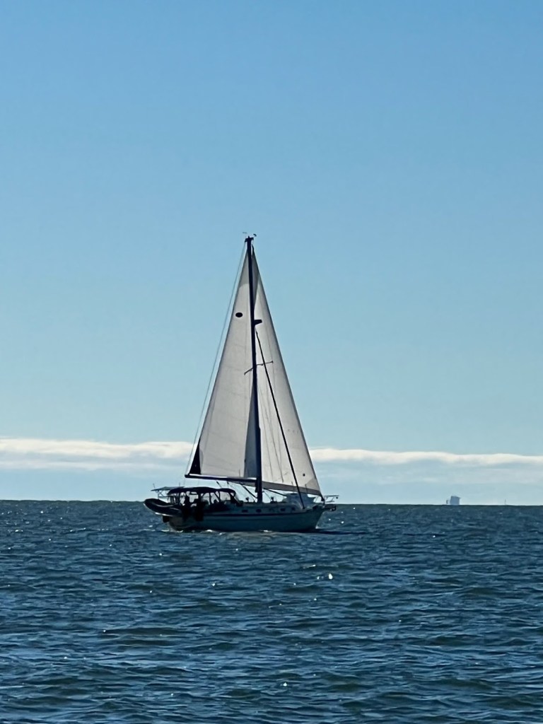 As we were mentally working out what the problem might be, we were still sailing down the Chesapeake Bay with just our head sail in about 20 knots of wind, making 6 – 7 knots through the water with the waves coming from behind us.