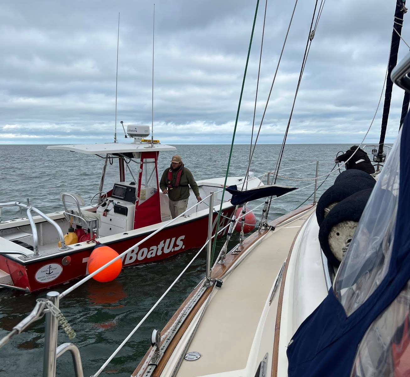 Luckily the Tow Boat US guy was waiting right there when we arrived, so we were able to drop our sail and have him hook up his boat along side us and tow us in. Now in the boating community, when a boat gets towed into a marina, this is noticed by everyone and anyone who is remotely near by. Yes, we are a spectacle. But, this is also extremely helpful since we had about 8 people on the dock to catch us as we came in with no engine. The tow boat guy brought us into the slip as far as he could and untied his lines from us as we drifted the rest of the way into the slip. That where 8 of our newest friends caught our lines and helped stop our boats forward momentum coming in.