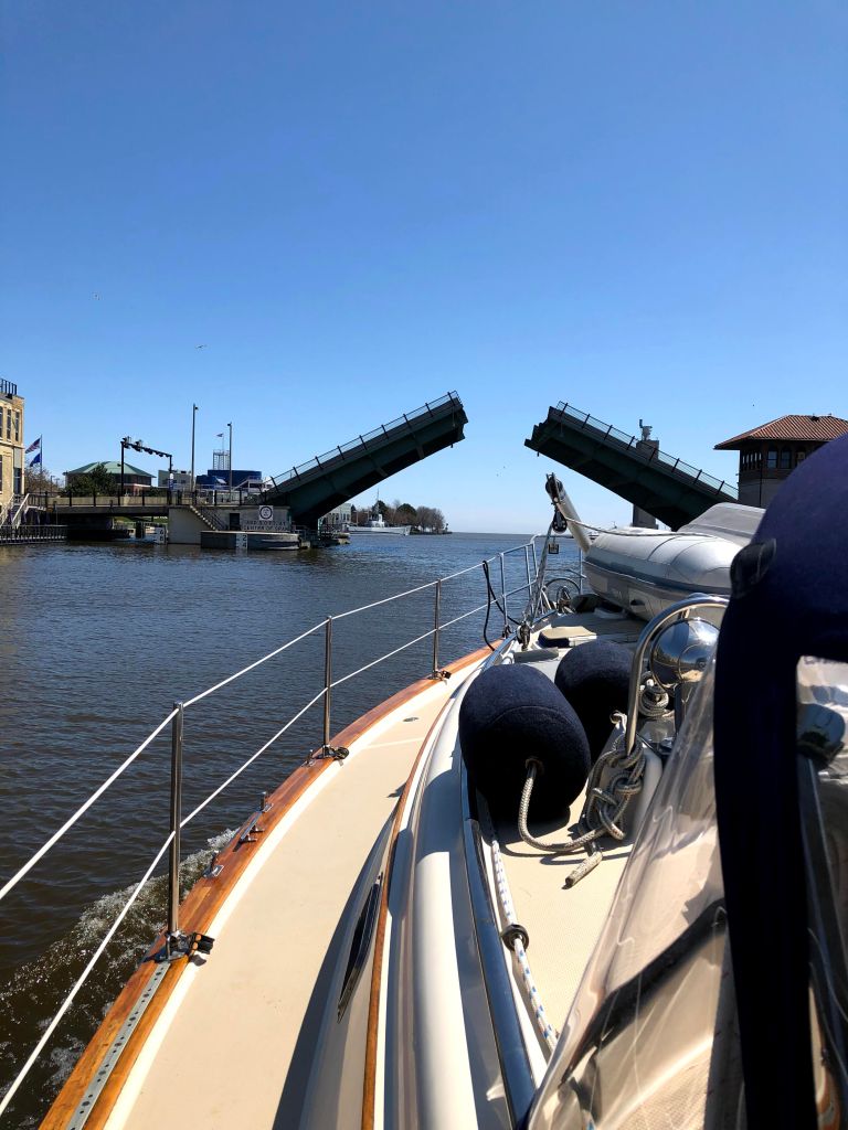 We continued to motor toward the bridge and watching, wondering if they would open by the time we got to the bridge. There was that moment of hesitation, should we slow down? He hasn’t stopped traffic yet. How long does it take for the bridge to open? Then we realize that the bridge tender has likely done this before (hahaha) even through we haven’t. He opened both bridges right as we got there. All was good.