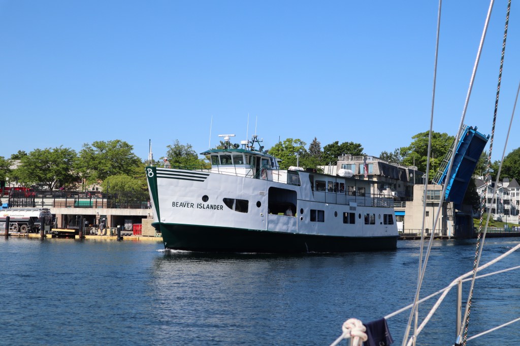 We tried to time our exit from Charlevoix to avoid the ferry boat, Emerald Isle, that goes between Charlevoix and Beaver Island. The channel heading under the bridge and out to Lake Michigan is fairly narrow and we don’t want to be in a position of sharing the channel with the large ferry boat. We avoided the Emerald Isle however, as luck would have it, her sister ship, the Beaver Islander was making her way back into Charlevoix as we were leaving. So, once the bridge opened, we waited for the Beaver Islander to make her way into Charlevoix before we made our way under the bridge.