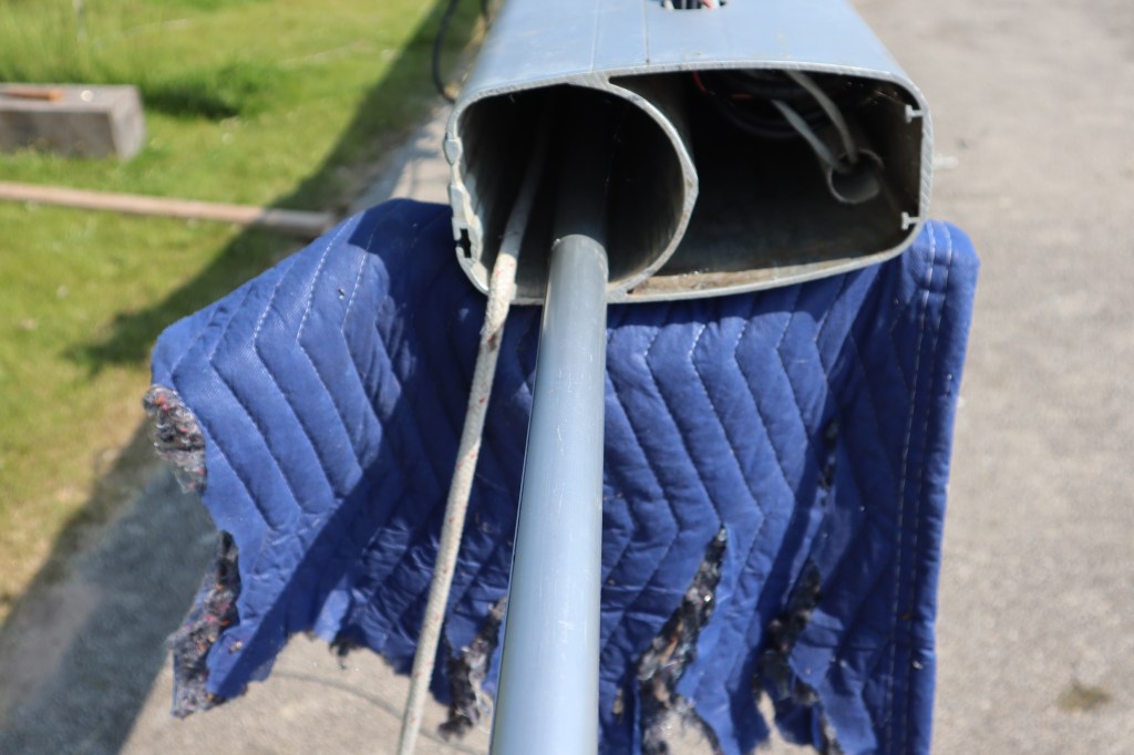 Next step – have marina service staff remove the furling foil so that it can be repaired. Here is a photo of the actual foil coming out of the bottom of the mast so that a new section can be spliced together where the cracked portion is.