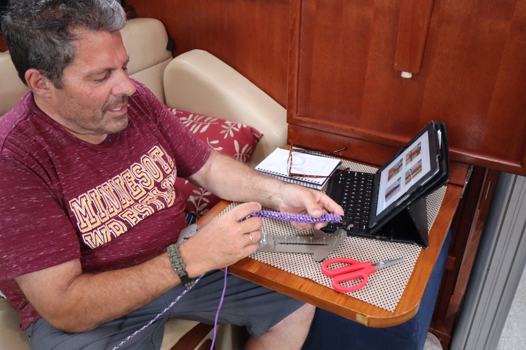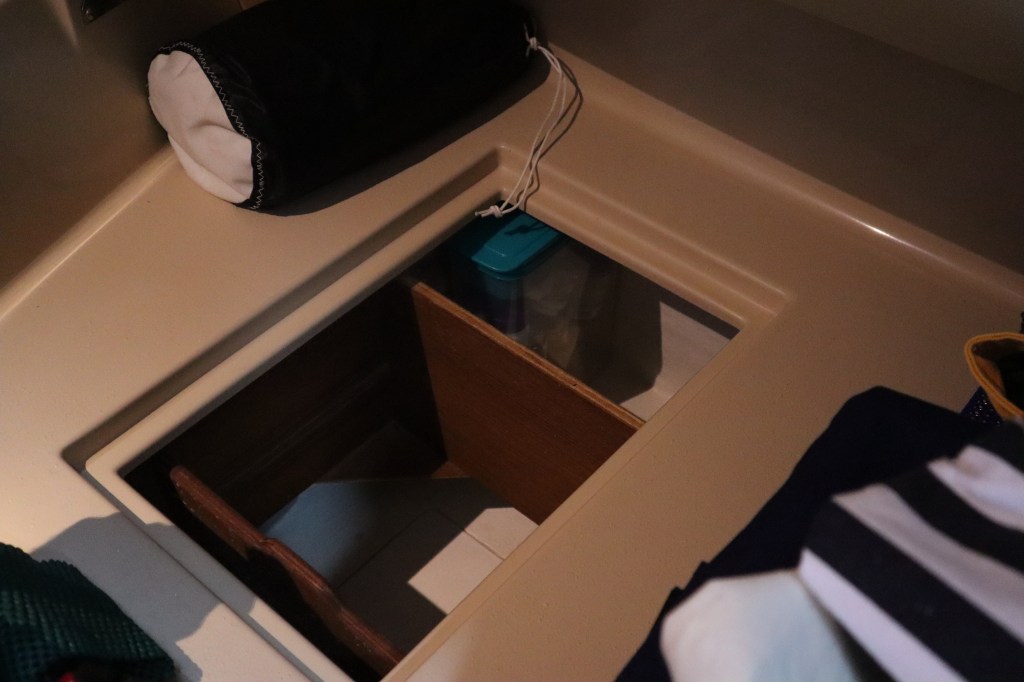 One of the things that is a bit different is how we store things and how we have to play “Jenga” to move things to get to other things. As a result, anything we do on the boat takes twice as long. As an example, Mark thought he would make me a bracelet out of paracord to pass the time. The items he needed to do this are stored under our bed. This requires moving all the things from under the bed, opening the compartment, finding the container that the paracord is stored in and getting it out and then reversing all these steps to put it back. It looks something like this:
