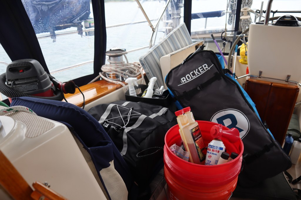 Running the generator snowballed into checking it out and then changing the oil since Mark was already in there. Again, we play boat “Jenga” since everything that we store in our cockpit lockers (lazarettes) has to be removed to get underneath the cockpit where our generator lives. The cockpit lockers are rather large and here are all our worldly possessions removed to change the generator oil.