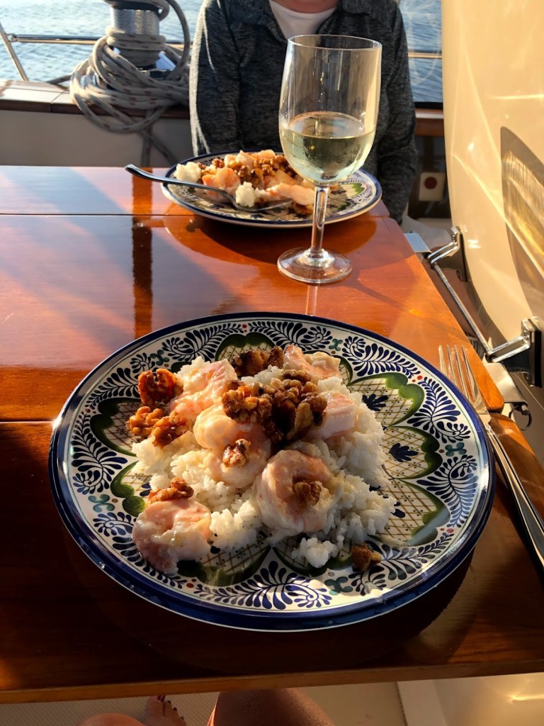 The next day, we woke up to the peace and serenity that being alone at anchor affords. We knew we had some rain showers coming this morning and it rained for several hours starting mid-morning and into early afternoon. It wasn’t a storm front but a long passing shower. We spent the day inventorying the pantry to see what groceries we have used in the last month and what things we now need from the grocery store.