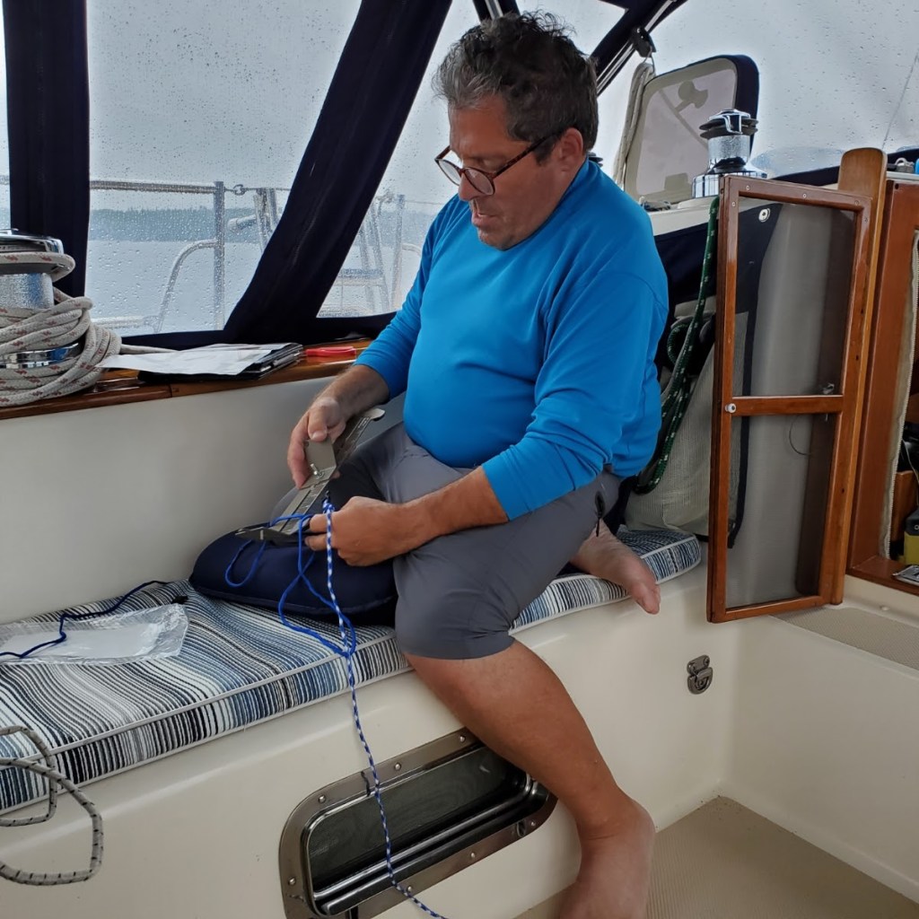 Anchoring here was straightforward. Lots of room. Good holding in mud and very peaceful Once we anchored, we were the only boat to be seen for miles. No one here. No internet. No cell service. Here’s Mark and I with the anchor down, getting the Mantus anchor bridle in place.
