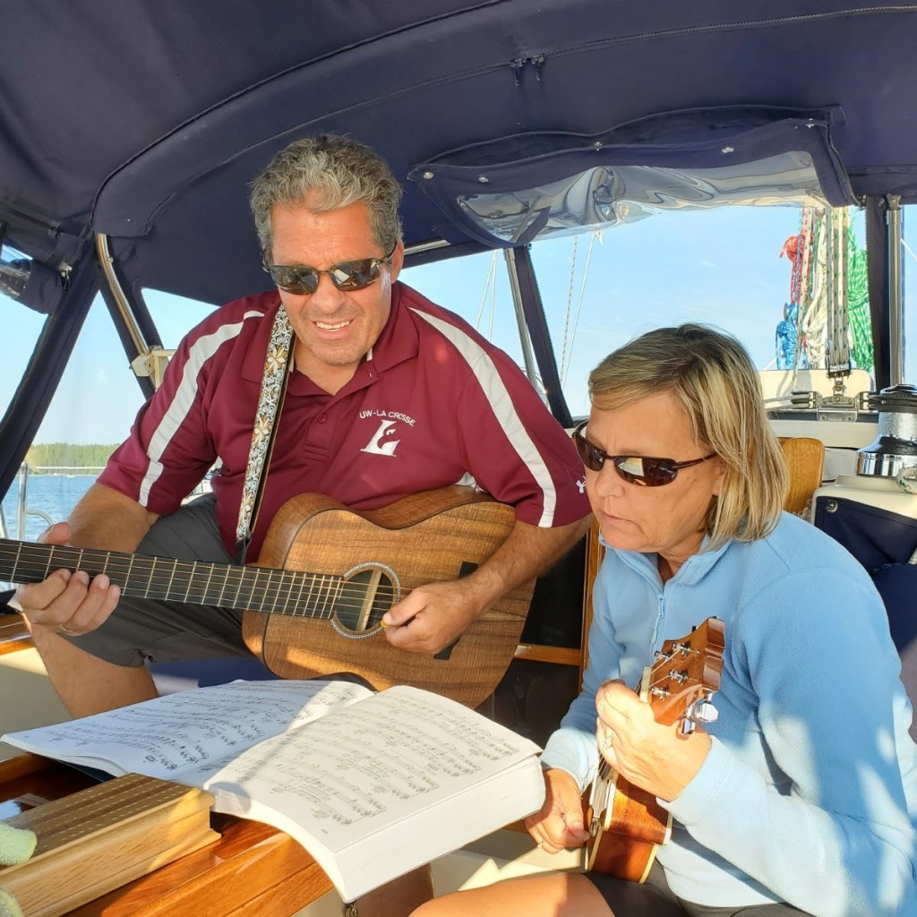 Then we had a bit of a sing along to the Eagles (no not the birds, the musical group). Mark and I broke out our guitar and uke to try to play along. Camille didn’t jump overboard at our attempt.
