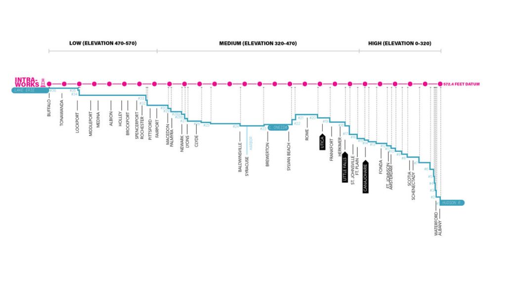 So, the middle section of the Erie Canal from like Newark to Sylvan Beach is the lowest section of the canal, other than the most eastern portion that drops significantly in elevation down to the Hudson River. This is why the middle section was closed due to flooding and why it is also known as the swamp of the Erie Canal. This area is also known as Montezuma National Wildlife Refuge. So, lots of birds and also lots of mosquitos the size of birds. You can see in this elevation view of the Erie Canal what I am talking about.
