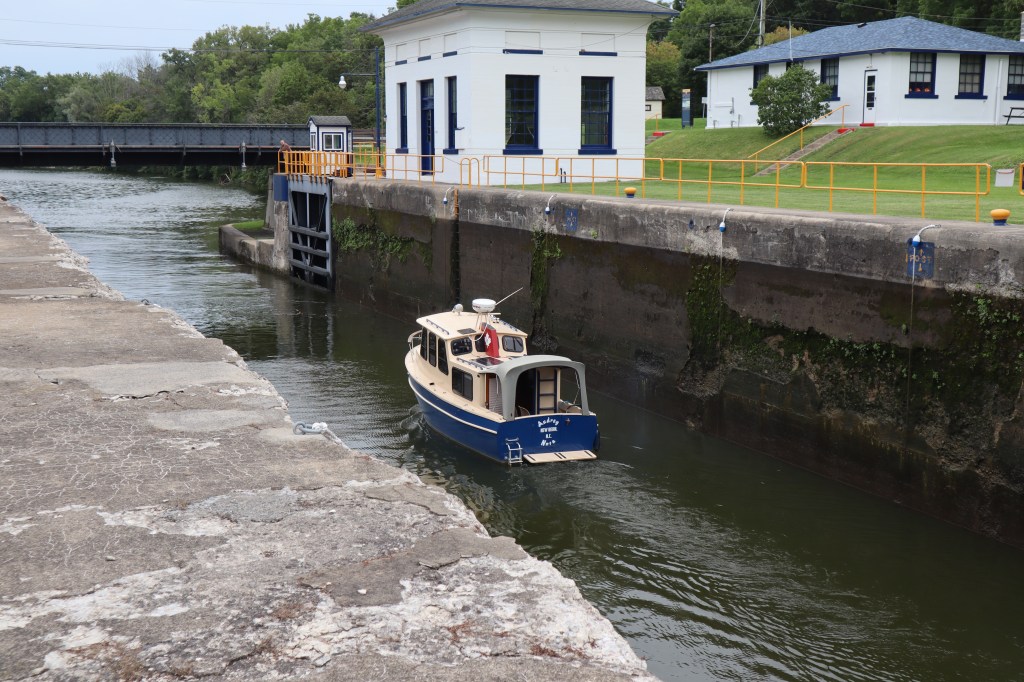 Once we got closer to lock 25 at May’s point, we had heard that there weren’t many things to tie a boat to on the wall. We texted ahead to John, who confirmed that there were rings and bollards to tie to in some places. In other places we might have to get creative what we tie to.