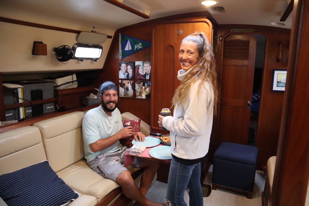 We decided since we were all friends, a couple new ones and many of us from Newark, it was a great night to have a pizza party. We polled what each boat had in their pantry to contribute to the makings of homemade pizza. Everyone contributed and we were able to make about 6 pizzas for a crowd of 11 people. It was a fun night!