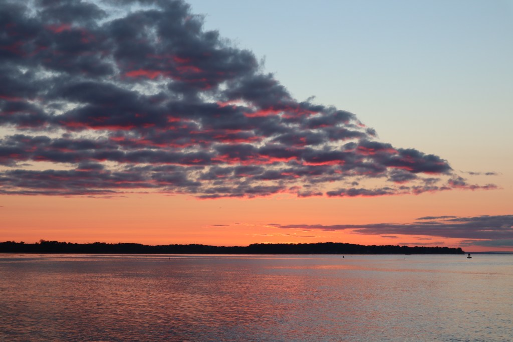 First up, we have to cross Lake Oneida. This is one of the largest lakes in New York, other than the Great Lakes. The lake is 21 miles long by 5 miles wide and an average depth of 22 feet. It’s because of this shallow depth that with any sort of significant wind, the chop on this lake can get significant quickly. We timed our transit for the quiet of the morning. The sunrise was spectacular this morning: