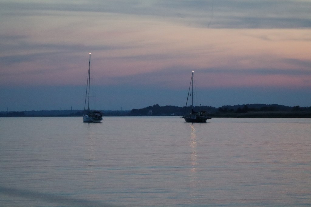 Normally sailboats will lie facing the wind when at anchor. However in this case we were pointed into the current. Once the tide turned later in the evening the boat turned around 180 degrees to face the other way.