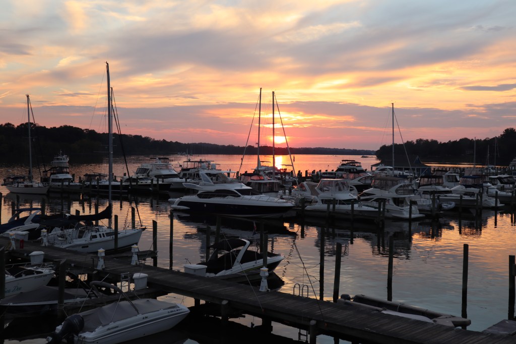 We made our way up the Sassafras River and headed toward Skip Jack Marina tucked up the Sassafras River. Once we got settled on the dock, we ate dinner at their restaurant near the marina and called it a night. There was a beautiful sunset over the marina and on the way to dinner we spotted an egret.