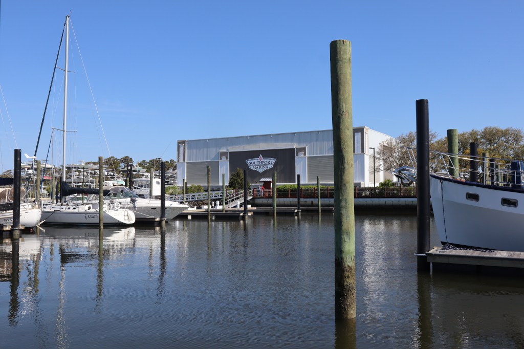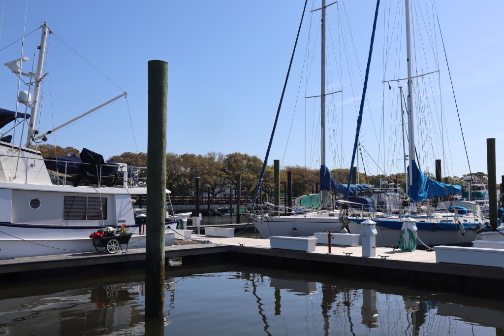As we approached the Southport marina we had a bit of a flood tide that would push us sideways as we turned to enter the marina and as we approached the slip. Once we entered the marina area off the ICW the effect of the current was much less and we were able to get into our slip without any issues. Once we got settled another boat was heading into the marina and it was a Mainship 390 with green canvas and at first glance we thought it might be our friends aboard Calypso. As the boat neared we determined it was a different boat and was not Calypso. However, we met the people aboard and helped them tie up as they approached. They are people who are on vacation and local to the area and traveling on their boat for about a week or so. However, they are looking to do the Great Loop so we chatted about the route and shared information and some laughs.