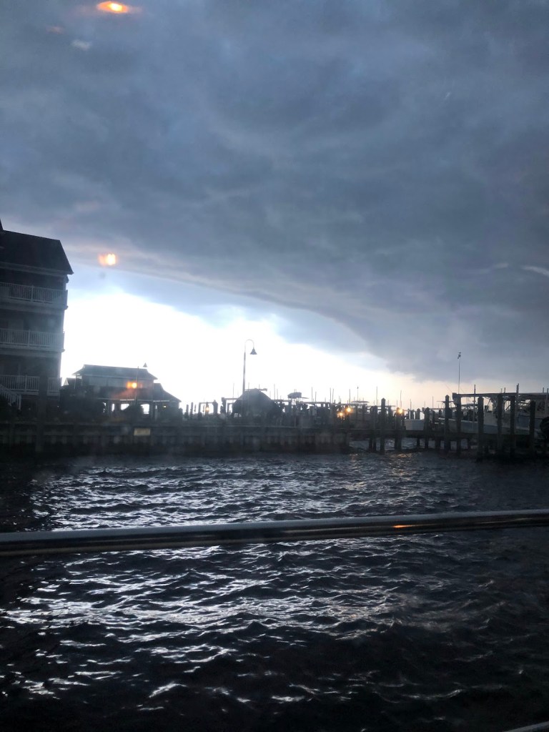 We made it back to the boat just as the wind was picking up and a few raindrops had started…PHEW! The marina staff at Belhaven Marina are top notch, they came out to all the boats to ensure everyone was tied up well and had enough fenders, etc to ride out the storm. They helped several boats put on an additional line or two and were busy putting away the lawn chairs and anything else that could get launched in a wind storm. Based on the sky, this looked like it was going to be a doozy!