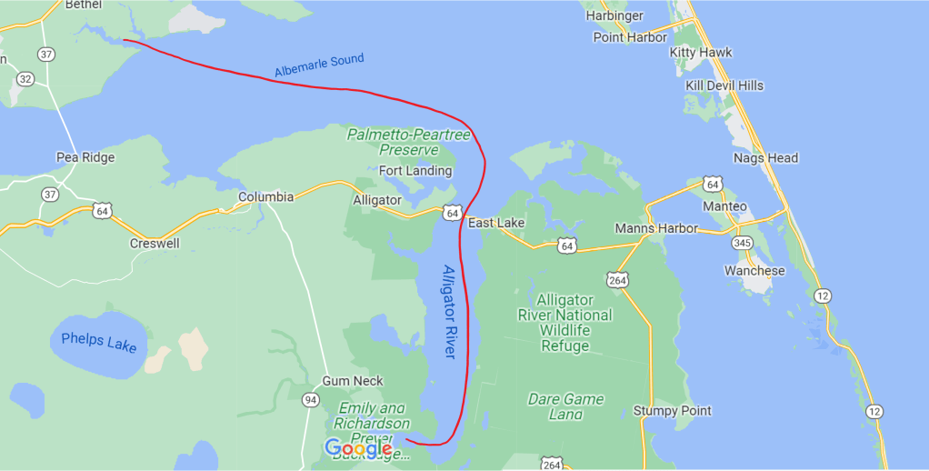 The red line starting at the bottom of the map below is where we anchored for the night at the base of the alligator river. It was a bit windy overnight, but the winds were out of the north and we were a bit protected just to the west of the base of the river.