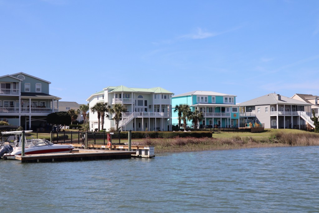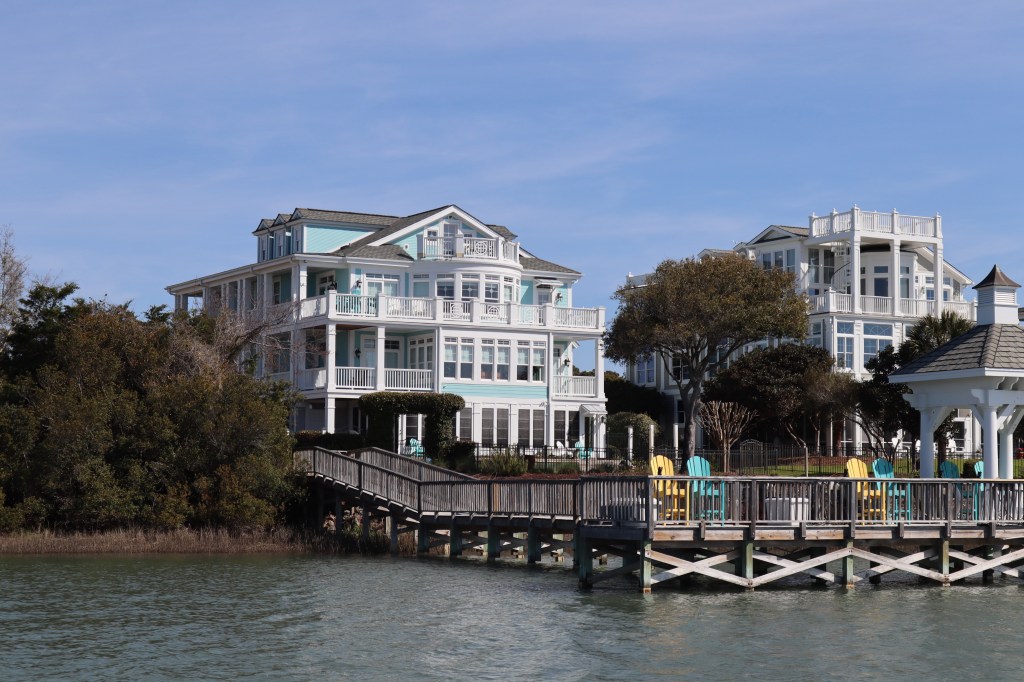 We didn’t leave Carolina Beach until about 10 am so we could time the tide and current in the Cape Fear River so we didn’t have a 4 knot opposing current slowing us down. St James Plantation is actually a very nice gated community that has gorgeous homes and happens to have a marina within the community and they also welcome transient boaters. So there is no town here to walk to, it’s very residential and quiet. They were nice enough to put us on the end of one of their docks so it was an easy in and out for us.