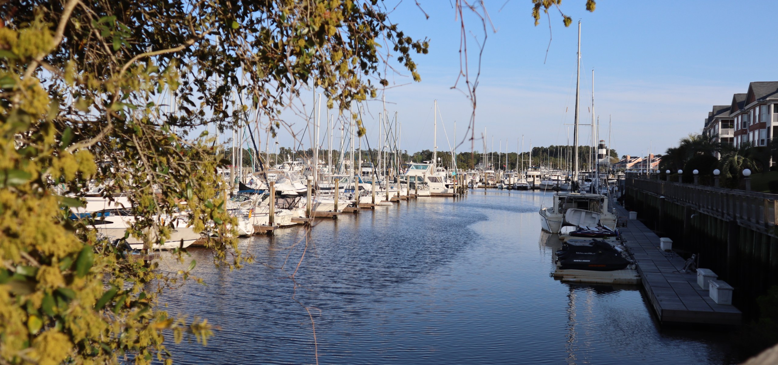 There are actually 3 marinas in this particular basin. The docks that run north/south on the left side is Lightkeeper’s Marina. The docks that run north/south on the right side is Coquina Yacht Club. And the docks that run east/west along the top is Myrtle Beach Yacht Club.